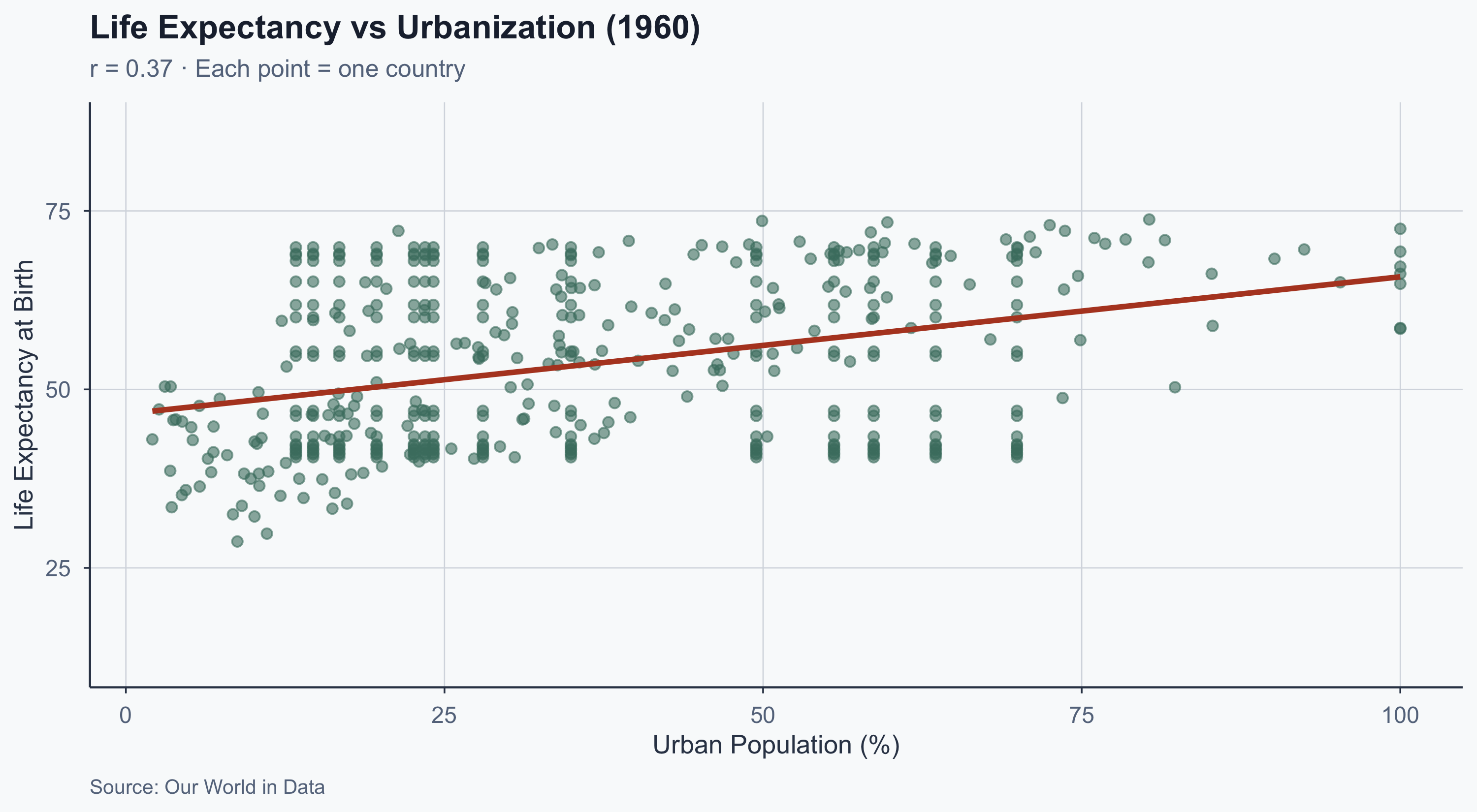 A correlation of \(r = 0.80\) tells us there is a strong association — it does not tell us that urbanization causes longer lives.