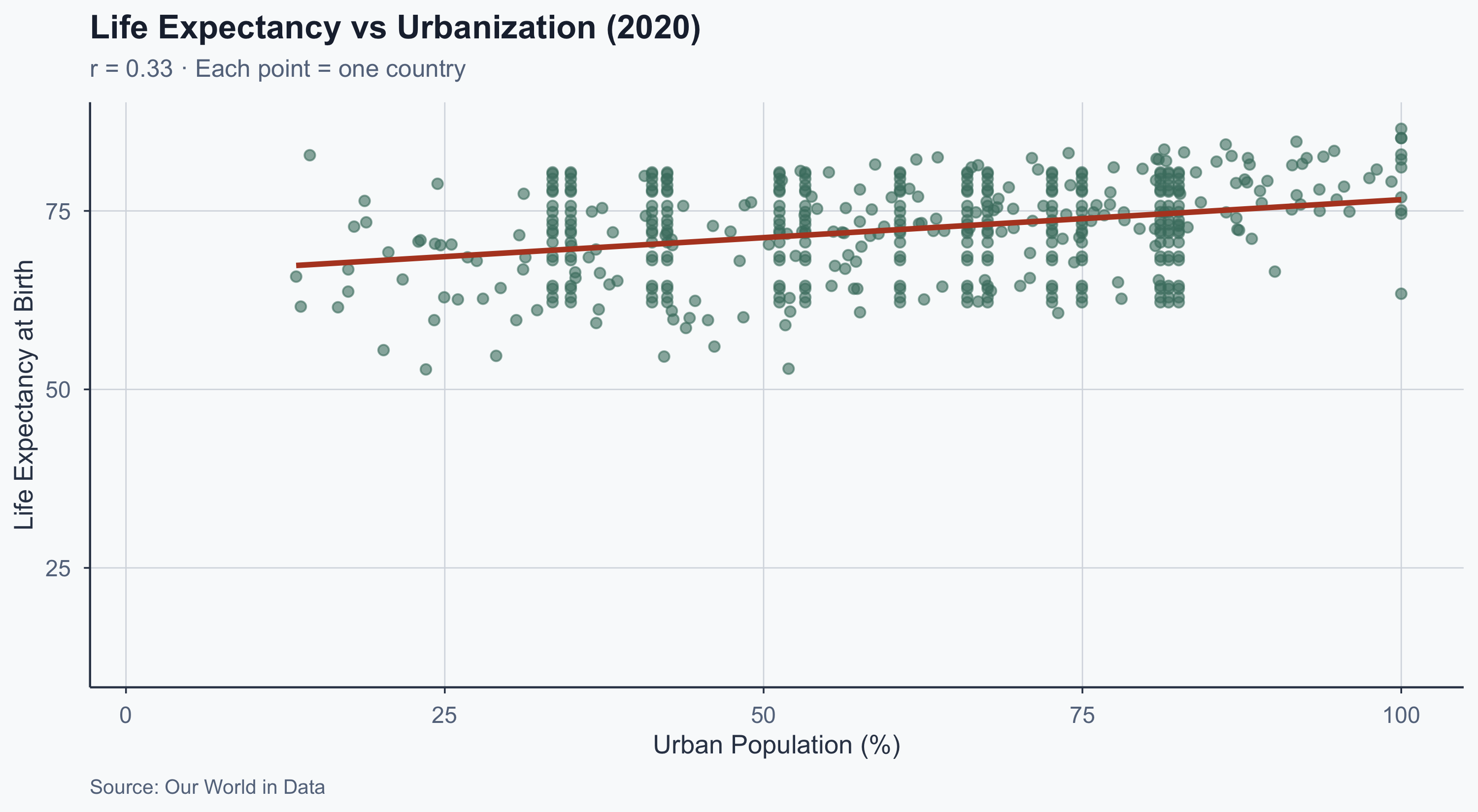 A strong positive correlation (\(r \approx 0.80\)): higher urbanization is associated with higher life expectancy. But what does this actually look like?